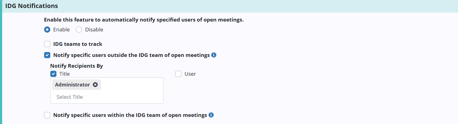 When Notify specific users outside the IDG team of open meetings is selected, a Notify Recipients By field will appear with the following checkboxes: Title and User. Use these fields to indicate which users should receive IDG notifications.