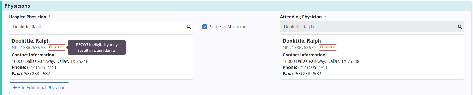 When a user creates or edits a patient’s profile and navigates to the Physicians tab, all hospice and attending physicians entered will display an icon detailing PECOS eligibility status. When users hover over the icon of physicians who are PECOS ineligible, a message will appear notifying the user that inclusion of the physician could result in claim denial.