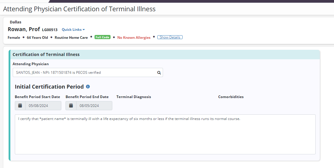 The physician’s PECOS verification status will also appear on the PDF copy of the certification of terminal illness.