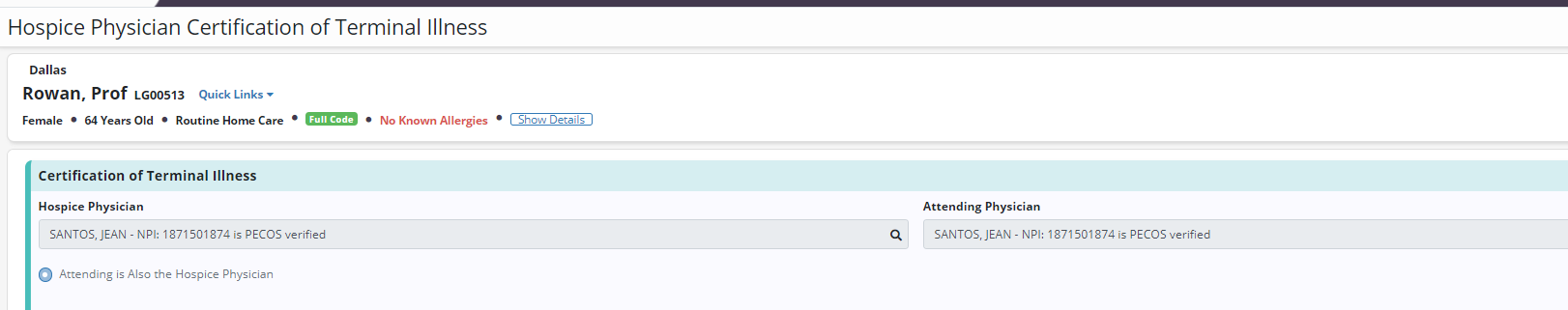 Users will also be notified of the physician’s PECOS status when completing the Attending Physician Certification of Terminal Illness and Hospice Physician Certification of Terminal Illness tasks.