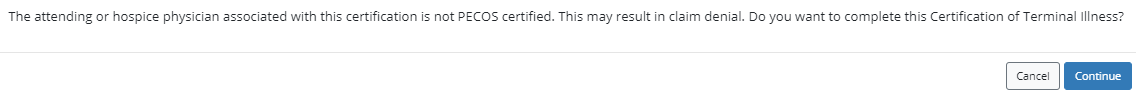 If the user selects Complete for either certification of terminal illness task and the physician is not PECOS-verified, the user will receive a notification alerting them to the physician’s PECOS status. The user can then select Cancel to make corrections or Continue to complete the task.