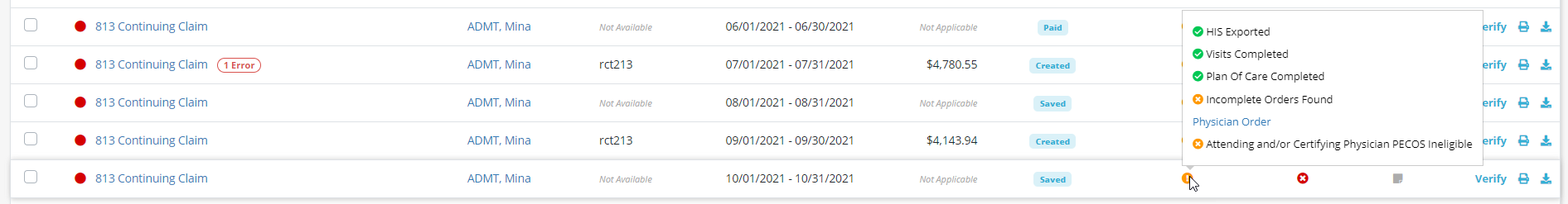 Claims submitted with a PECOS-ineligible attending or hospice physician listed on a certification of terminal illness will display a yellow exclamation mark in the Claim Holds column on the Claims screen.