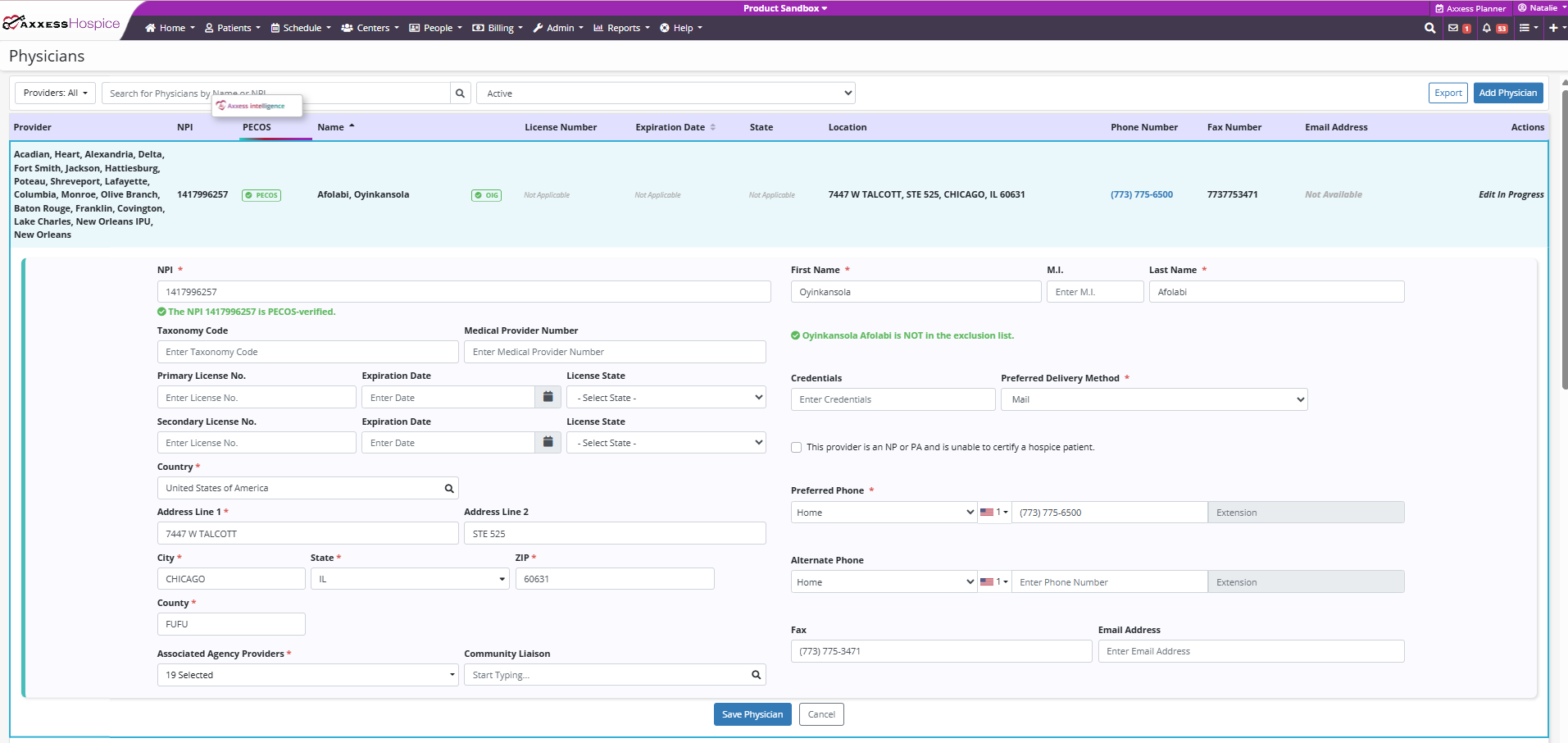 A PECOS eligibility check will occur when a physician is initially entered into Axxess Hospice. Once entered, the physician’s PECOS status will be checked twice a week.