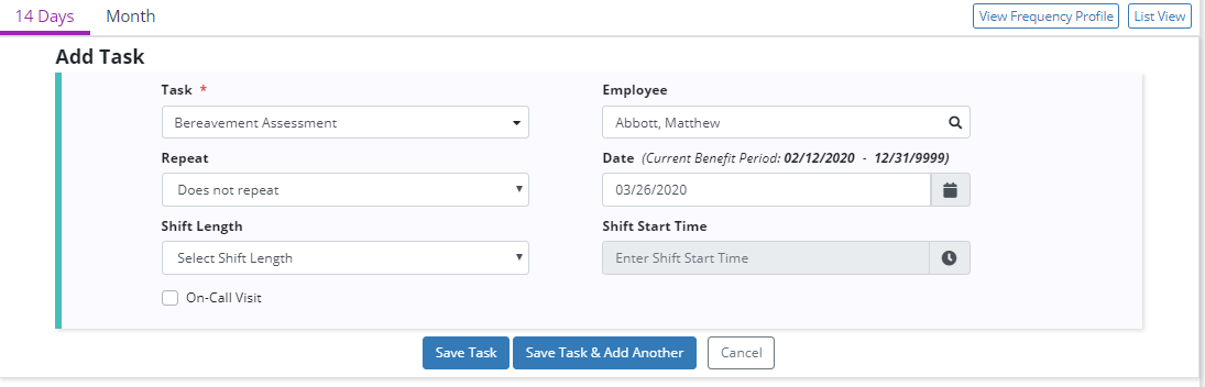 In the task window, select the bereavement task, assign the appropriate team member and enter a date for the task to be completed. Click Save Task or Save Task & Add Another to continue scheduling bereavement tasks.