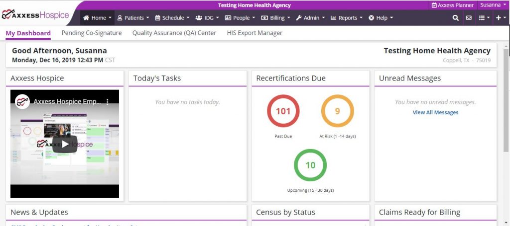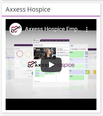 The welcome panel in the top left corner of the screen features current noteworthy video content. Axxess updates this panel with current announcements, relevant training videos, software updates or other important information that users should review upon logging in.