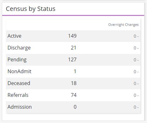 The Census by Status tile displays the number of patients that are in active, discharged, pending and deceased status, and the number of referrals and admissions. Admissions show all patients who changed status from Pending to Active over a set time period. Each status is a hyperlink that users can click to view a list of patients in that status.