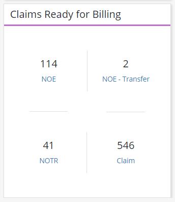 The Claims Ready for Billing tile displays the number of NOE, NOE – Transfer, NOTR, and total claims. Users can click any of the hyperlinks to view a list of claims in that category.