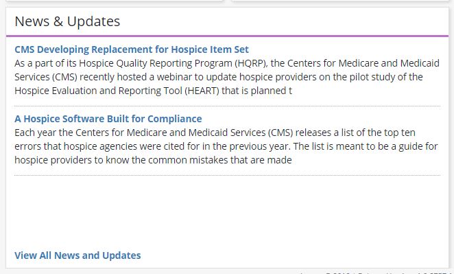 The News & Updates tile features links to Axxess blog posts, educational articles, regulatory updates and other important information and resources to help hospice organizations succeed. Clicking View All News and Updates in the bottom left corner of the tile will direct the user to the Axxess blog page.