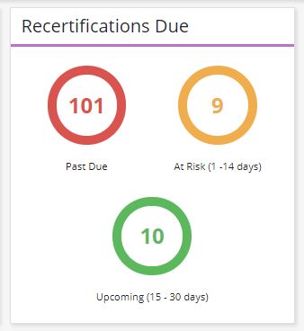 The Recertifications Due tile displays upcoming recertifications with different colors to indicate urgency. The red circle shows the number of past due recertifications. The yellow circle shows the number of recertifications at risk, which are due in the next 1-14 days. The green circle shows the number of upcoming recertifications due in the next 15-30 days. Clicking on a circle directs the user to a list of patients in the corresponding recertification category.