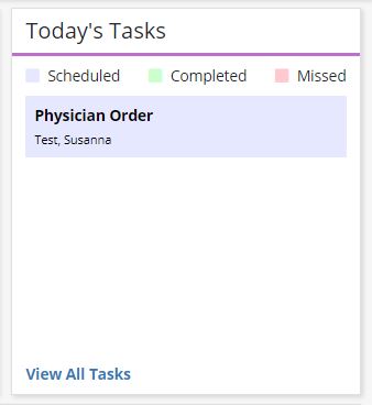 A daily to-do list is provided in the Today’s Tasks tile. Users can quickly access a patient’s chart and/or task for the first five patients on their to-do list by clicking on the task hyperlink on this tile. In the bottom left corner of the tile, clicking View All Tasks will direct the user to his/her complete schedule.