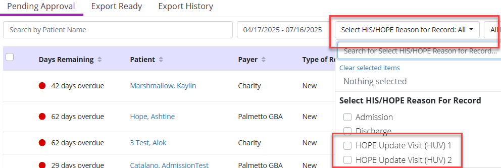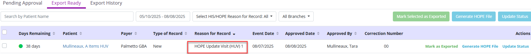 Once records have been approved in the Pending Approval tab, they will be moved to the Export Ready tab. If the record is an HUV1 or HUV2, the reason for the record will display in the Reason for Record column.