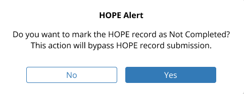 When Not Completed is selected, a pop-up message will appear. Select Yes to mark the HOPE record as not completed. Select No to submit the record.