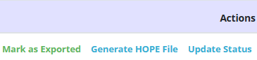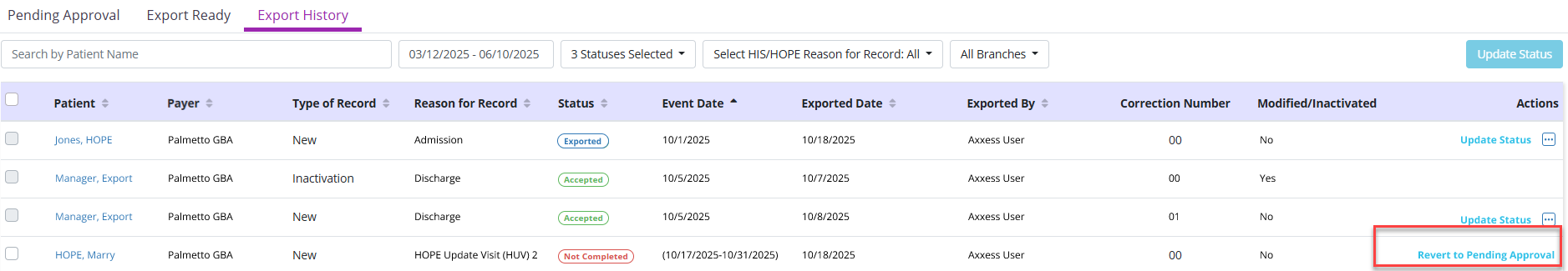 If the record needs to be edited before generating the HOPE file, select Update Status in the Actions column, then select Pending Approval from the drop-down menu. This will place the record back on the Pending Approval tab, where edits can be made and reprocessed.
