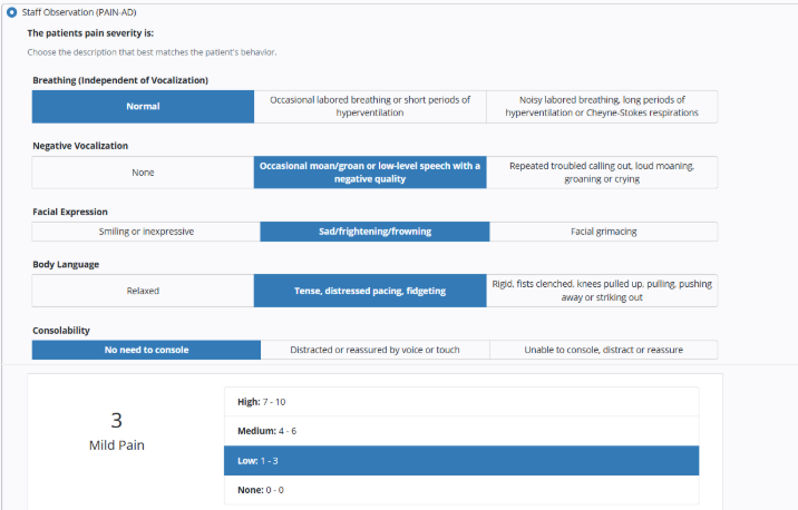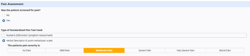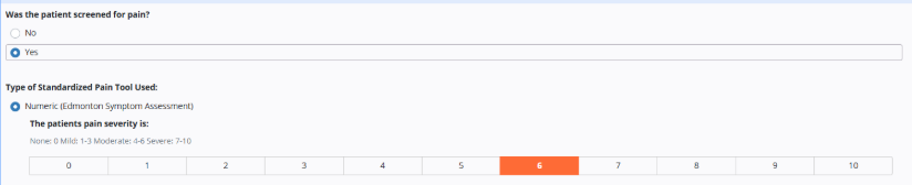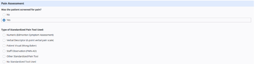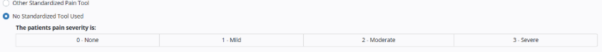 Select No Standardized Tool Used if a tool wasn’t used and select the pain severity.