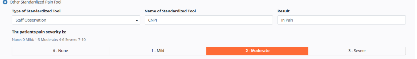 Select Other Standardized Pain Tool if a different pain tool was used. Select the type of tool, enter the name and result and select the pain severity.