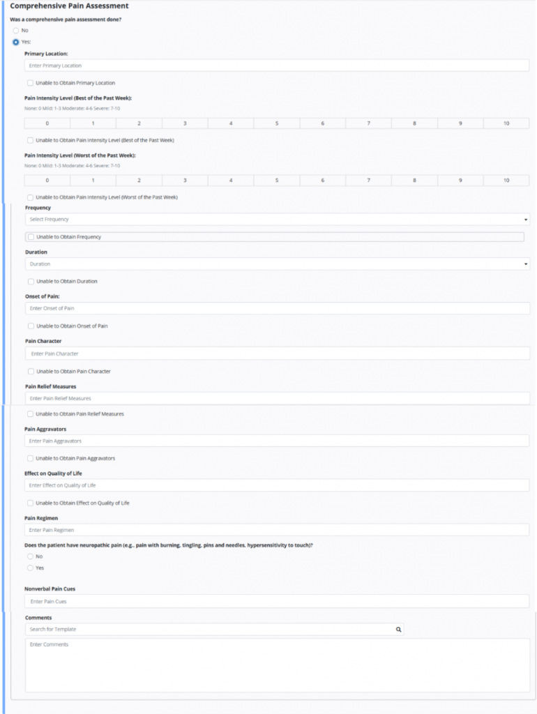 If a comprehensive pain assessment was completed, select Yes. This section is required at admission for HOPE documentation.