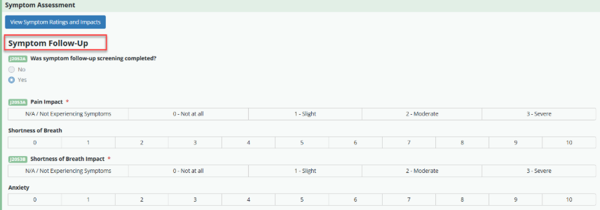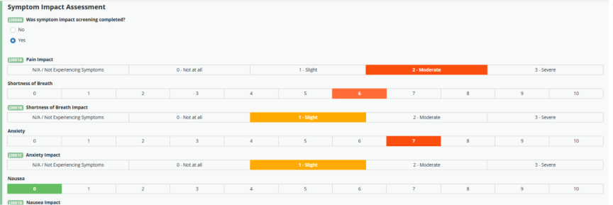 The Symptom Impact Assessment enables users to document the impacts of pain, anxiety, constipation, shortness of breath, nausea, vomiting, diarrhea, agitation, HUV between days 6-15 and HUV between days 16-30. A symptom follow-up visit is required if a a symptom impact is between 2-Moderate and/or 3-Severe.