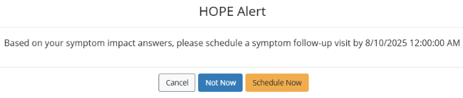 Any in-person nursing visit (RN, LVN, or LPN) can be used as a symptom follow-up visit. When the visit is opened, the module will automatically categorize it as a symptom follow-up assessment and require documentation by the clinician.