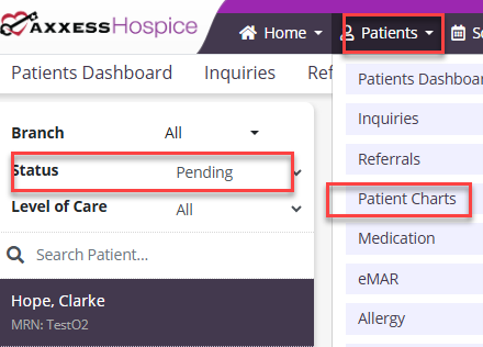 To admit a patient using the RN Initial/Comprehensive Admission – HOPE task, navigate to Patient Charts under the Patients tab and select Pending from the Status drop-down menu. Once selected, select a patient and click RN Initial/Comprehensive – HOPE.