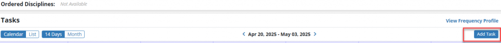 Patients tab ➜ Patient Charts ➜ Status menu ➜ Active➜ Select a patient ➜ View Patient Schedule ➜ Add Task ➜ Save Task