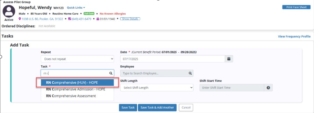 When completing the RN Initial-HOPE, RN Initial/Comprehensive-HOPE or RN Comprehensive Admission, frequencies can be added from within the visit. Adding the frequencies within the visits streamlines scheduling by ensuring there are frequencies for the HOPE Update Visits (HUV) and System Follow-Up Visits (SFV).