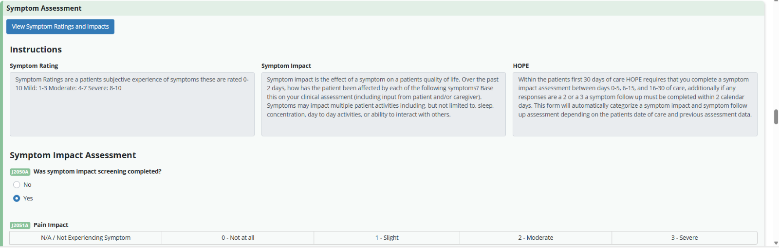 To meet the SFV requirements, a reassessment of the patient’s symptom impact must be completed. SFV data is associated with correlating ADM, HUV1, or HUV2 record types for HOPE record requirements per CMS.