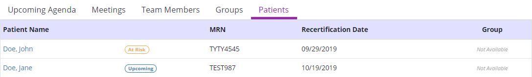 A badge appears next to the patient’s name to alert users to upcoming and past due recertifications dates: