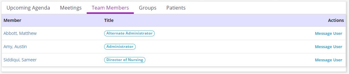 The Team Members tab displays a list of users who have been added to the team. To the right of each team member’s name and title, the Message User link in the Actions column enables users to message any team member directly from this screen.