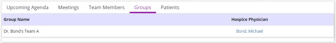 The Groups tab displays the group name and hospice physician of each group within the team. The Edit Groups link in the top right enables the user to update the team’s groups.