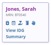 Each patient tile provides an icon to go directly to the Patient Chart, Patient Schedule, Plan of Care Profile, Medication Profile, and Allergy Profile. Users can hover over an icon to see where it leads. Clicking View IDG Summary enables the user to view and update the IDG Summary.