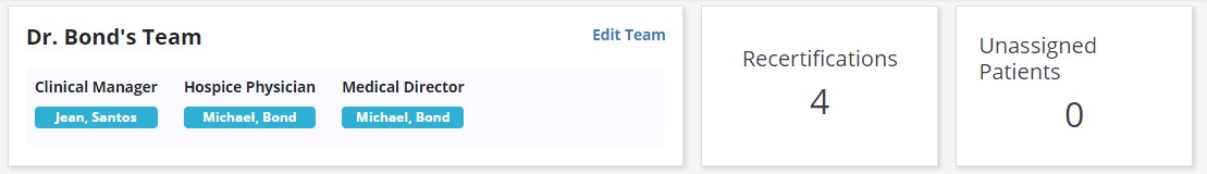 Select a team from the left-side menu to view details. In the top left tile, the team name and team members are displayed. The team name and team members appear in the top left tile, and the number of Recertifications and Unassigned Patients appear in the top right. Click Edit Team to add or update team information.