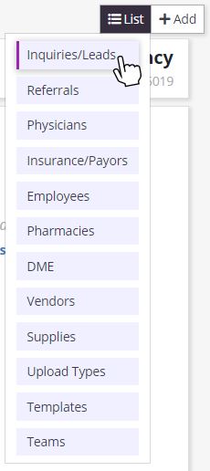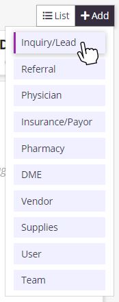 Add an inquiry/lead by clicking the +Add button in the top right corner of any screen in the Axxess Hospice system.