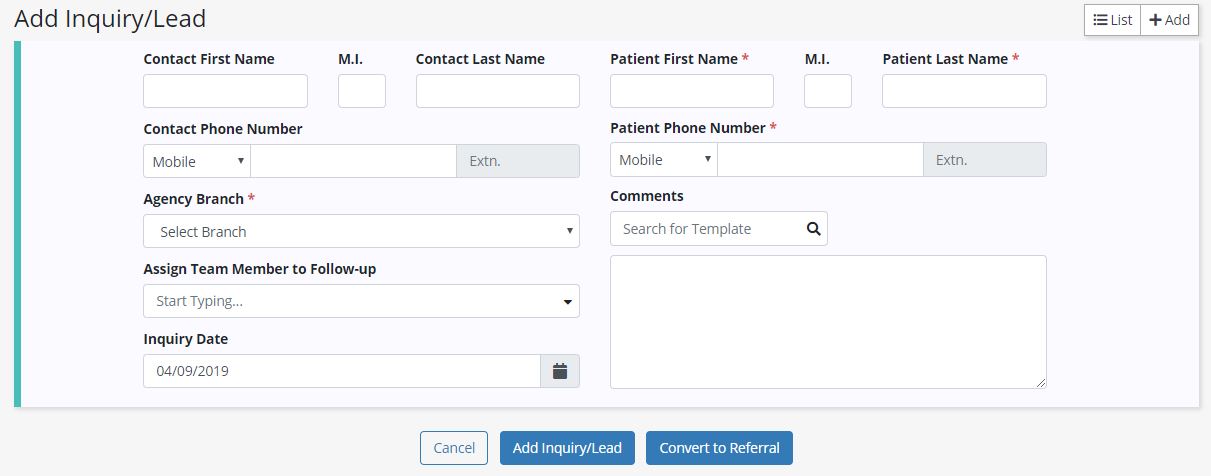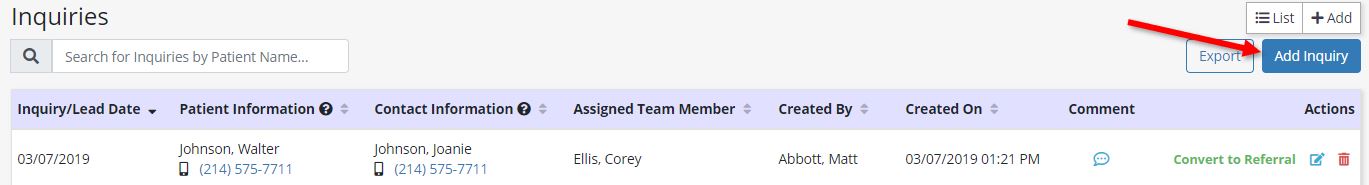 Enter the patient’s information in the Add Inquiry/Lead box. Fields with red asterisks* are required.