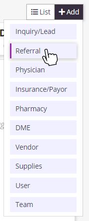 Add a referral by clicking the +Add button in the top right corner of any screen in the Axxess Hospice system.