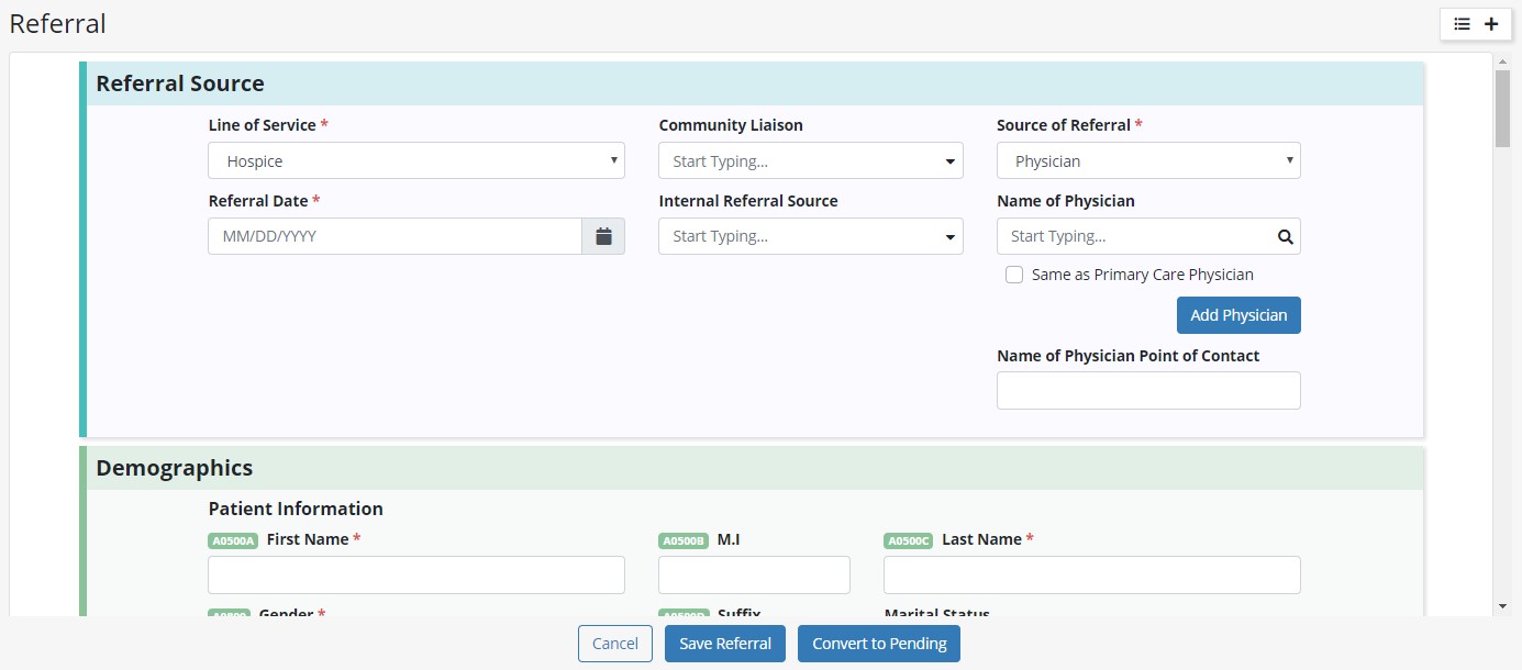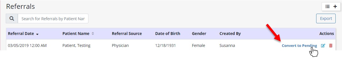 Convert a referral to pending by selecting Convert to Pending in the Actions column of the Referrals List. The following fields are required to convert a referral to pending: Medical Record Number (MRN), Default Service Location, and Primary Payer.