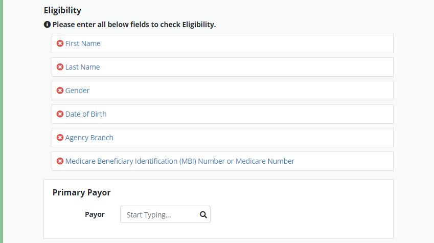 In the referral form, you can check the patient’s Medicare eligibility using the Medicare Eligibility Check feature in the Payer Information section. In this section, red x icons will display next to fields that have not been entered that are required to run an eligibility check.