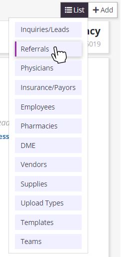 All active referrals will display in the Referrals List. You can access this list by clicking the List menu that appears in the top right corner of all pages in Axxess Hospice and selecting Referrals from the drop-down menu.