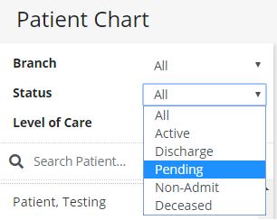 To locate a specific Patient Chart for a patient in pending status, select Pending in the Status filter drop-down menu. (The Status filter defaults to Active when the Patient Chart screen is opened, since most management of Patient Charts occurs for active patients.)