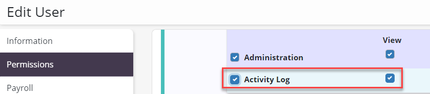 To give a user permission to view the activity log, edit the user’s profile and navigate to the Permissions tab. In the Administration section, select View next to the Activity Log permission. Click Save to finish granting the permission to the user.
