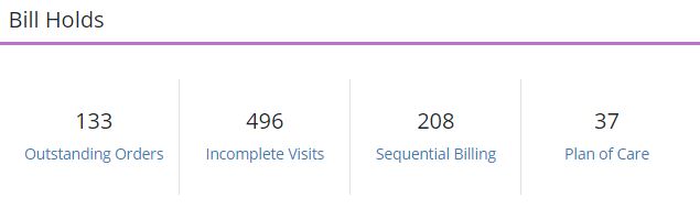 The Bill Holds tile shows a count of items that may prevent claims from going out for any of the following reasons: Outstanding Orders, Incomplete Visits, Sequential Billing, and Plan of Care. Orders that have not been returned as signed from the physician, visits from any discipline that have not been completed, claims that have been submitted out of sequence, or unsigned plans of care are tracked here and updated in real time.