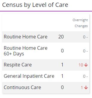 The Census by Level of Care tile shows a breakdown of the hospice’s active patients by level of care. Routine Home Care (RHC) patients are divided into two buckets to align with the tiered payment structure for RHC: