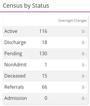 The Census by Status tile shows a breakdown of patients by status and any referrals and admissions. Overnight changes are highlighted, and any changes made after 5 PM local time the previous day appear on this tile.