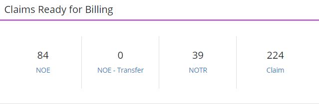 The Claims Ready for Billing tile shows a count of claims (by claim type) that are ready to be billed. Claim types include NOE (81A), NOE-Transfer (81C), NOTR, and Claims. This tile will not show any information unless billing permissions are granted to the user.