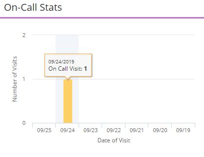 The On-Call Stats tile shows a count of the number of visits marked as on-call for the last seven days beginning with the current day. Hover over a bar in the graph to view the date and number of visits made on that day.