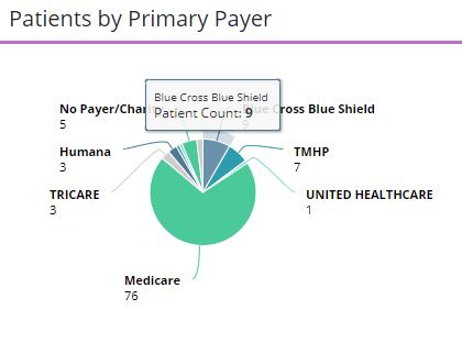 The Patients by Primary Payer tile shows a breakdown of the payer mix in the agency. Hover over a piece of the graph to see the payer name and patient count for that payer. Click on a portion of the graph to navigate directly to a list of patients with the selected payer and export or print the list if necessary.