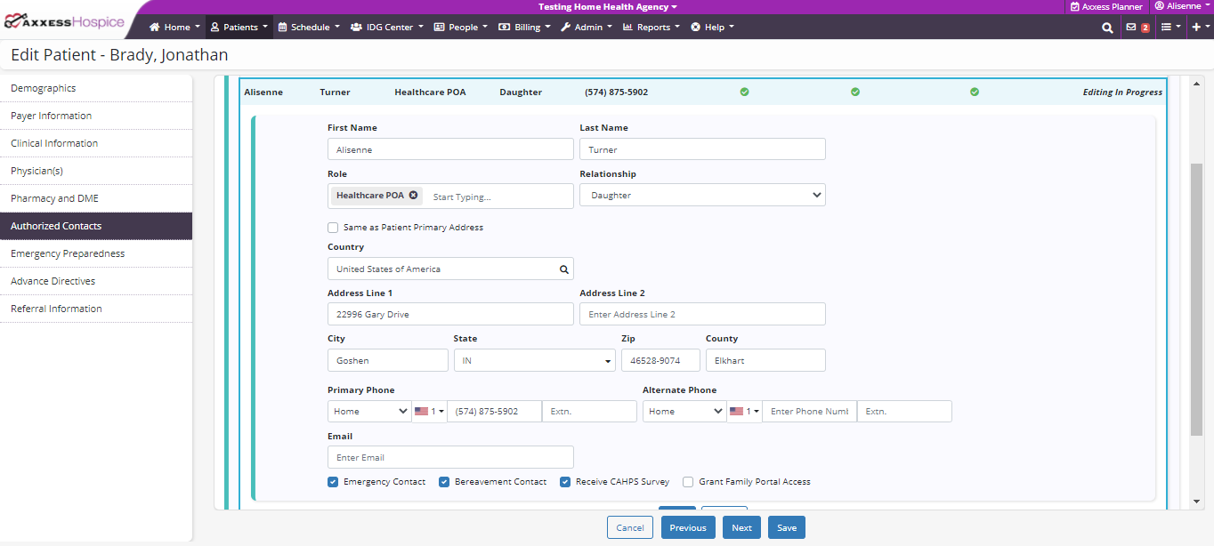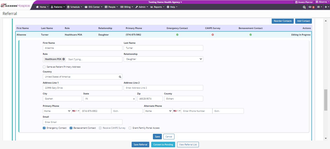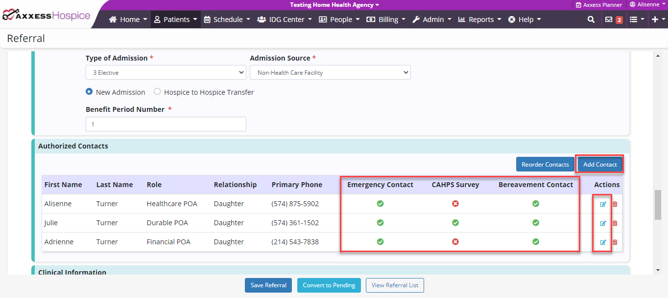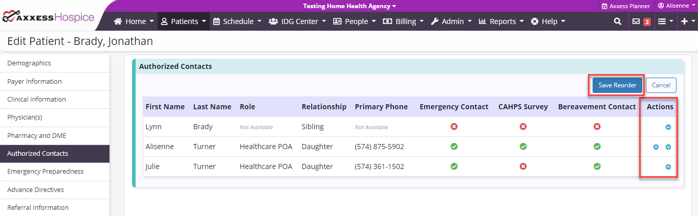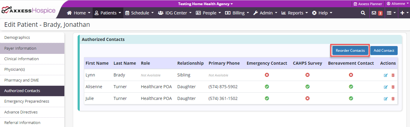 Axxess Hospice now enables users to sort patients’ authorized contacts by priority and easily view and manage contact designation details in referrals and patient charts.