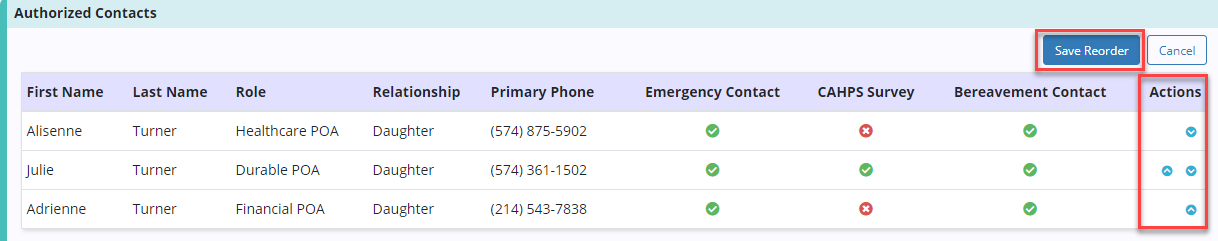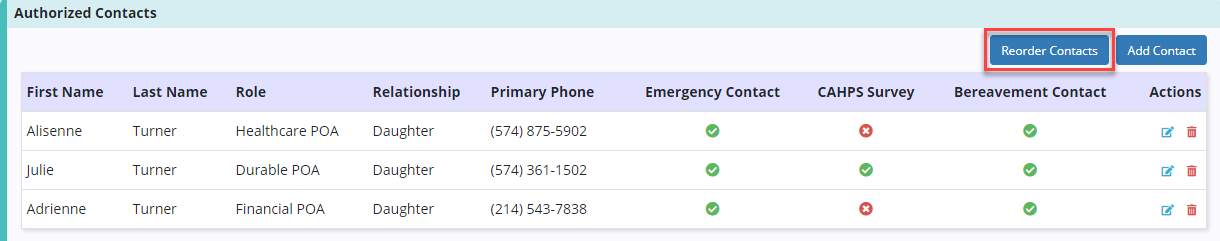 The new table under Authorized Contacts displays each authorized contact’s emergency contact, CAHPS survey and bereavement contact designation.