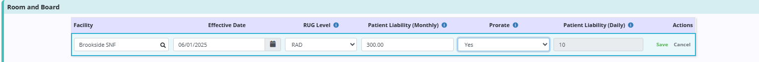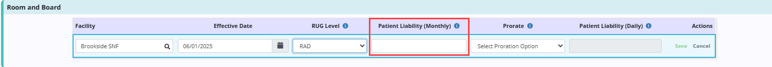 To enter the amount of monthly or prorated liability for a patient, navigate to the patient’s chart and click Edit Profile. On the Payer Information tab, navigate to the Room and Board section. Click the edit icon to edit an existing RUG level or click Add RUG Level to add a new level. Enter the patient’s monthly liability in the Patient Liability (Monthly) field.