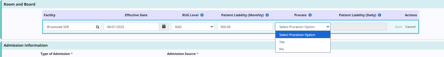 Select Yes or No from the Prorate field. If the patient’s liability is a fixed monthly rate, select No. If the patient’s liability is prorated based on the number of service days in the billing period, select Yes.