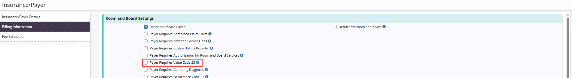 ➜ Insurance/Payers ➜ Edit ➜ Billing Information tab ➜ Room and Board Settings ➜ Payer Requires Value Code 23 ➜ Save